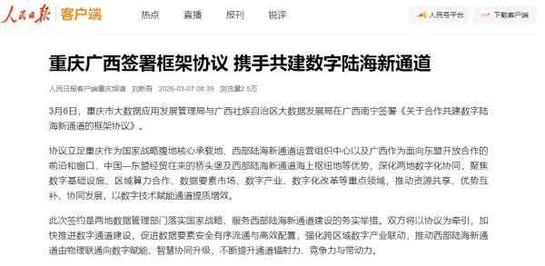 重庆广西签署框架协议 携手共建数字陆海新通道