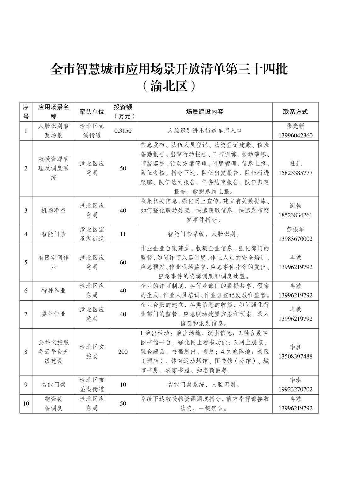 全市智慧城市应用场景开放清单第三十四批(渝北区)