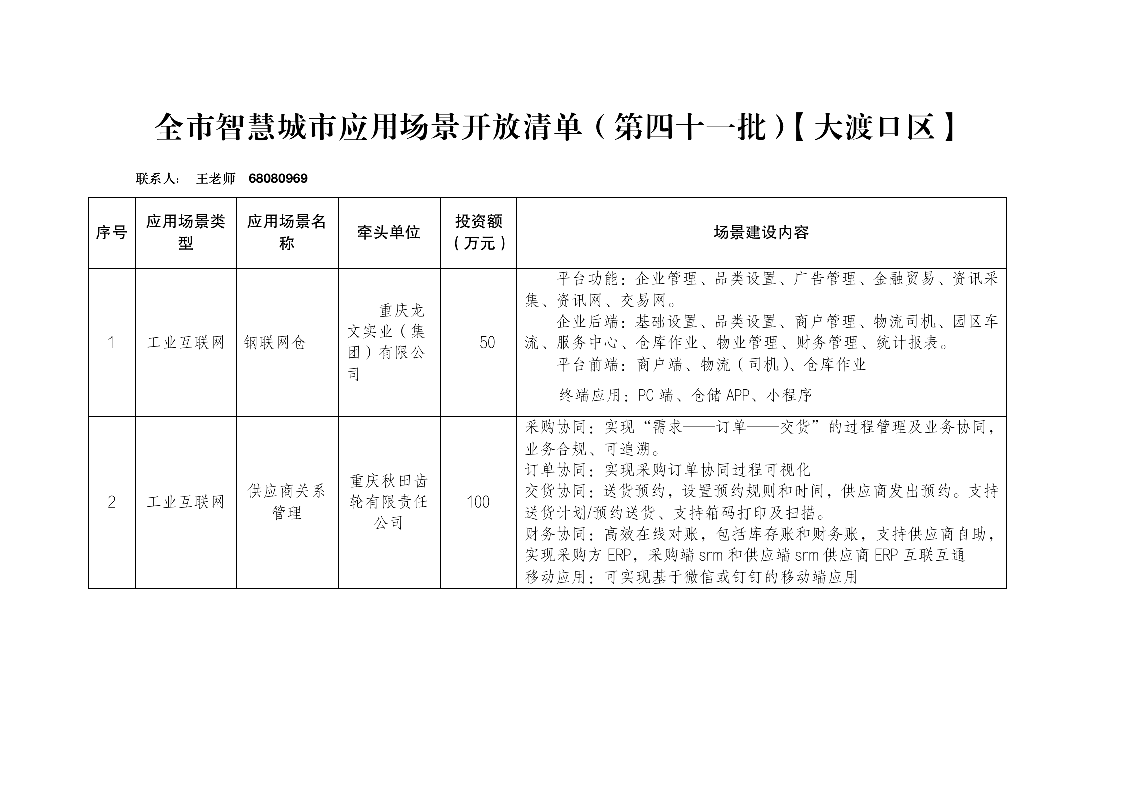 全市智慧城市应用场景开放清单(第四十一批)【大渡口区】
