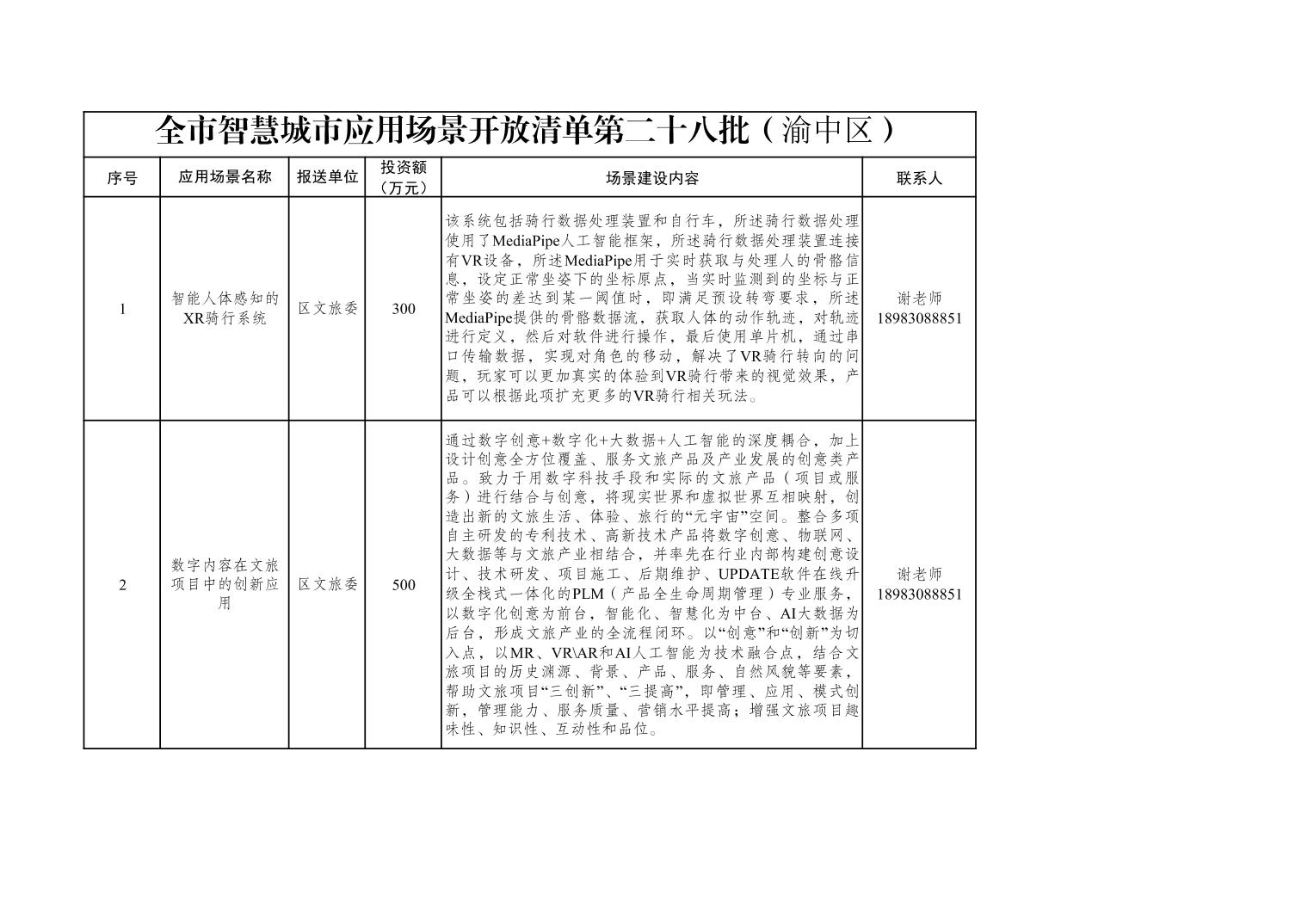 全市智慧城市应用场景开放清单第二十八批(渝中区)
