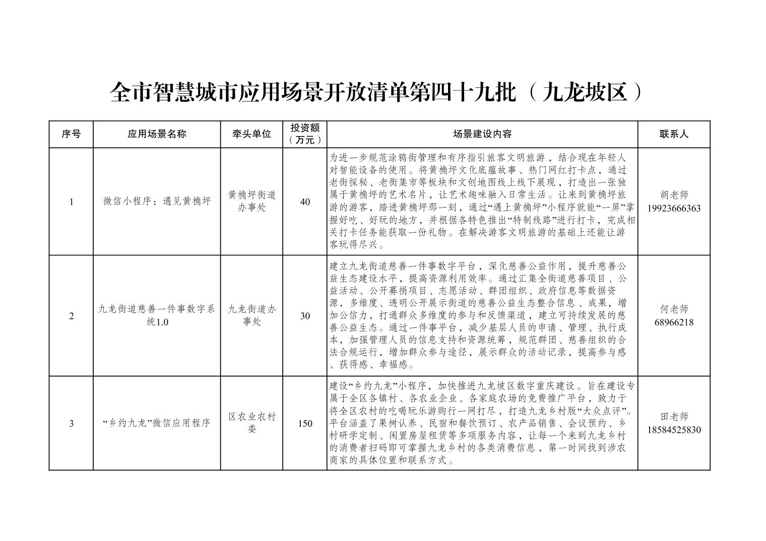 全市智慧城市应用场景开放清单第四十九批(九龙坡区)